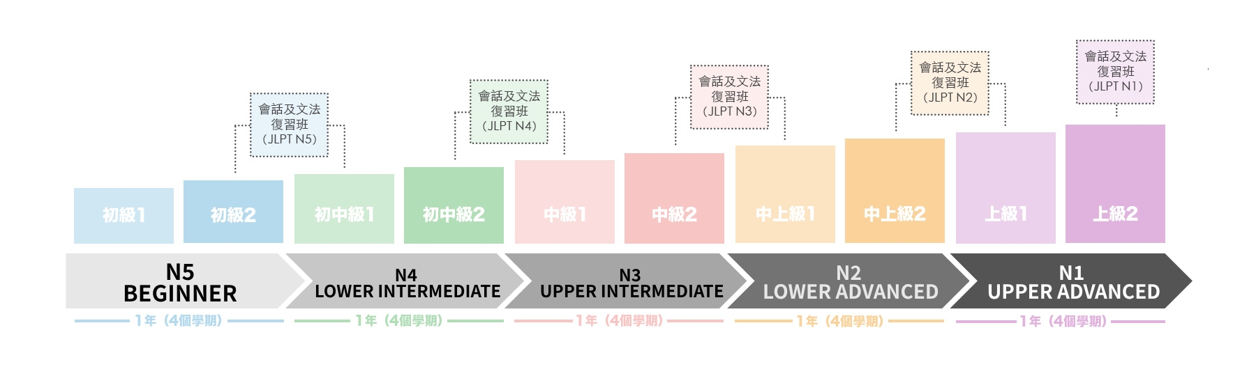 Each level course is 1 year with 4 terms of 12 lessons each.