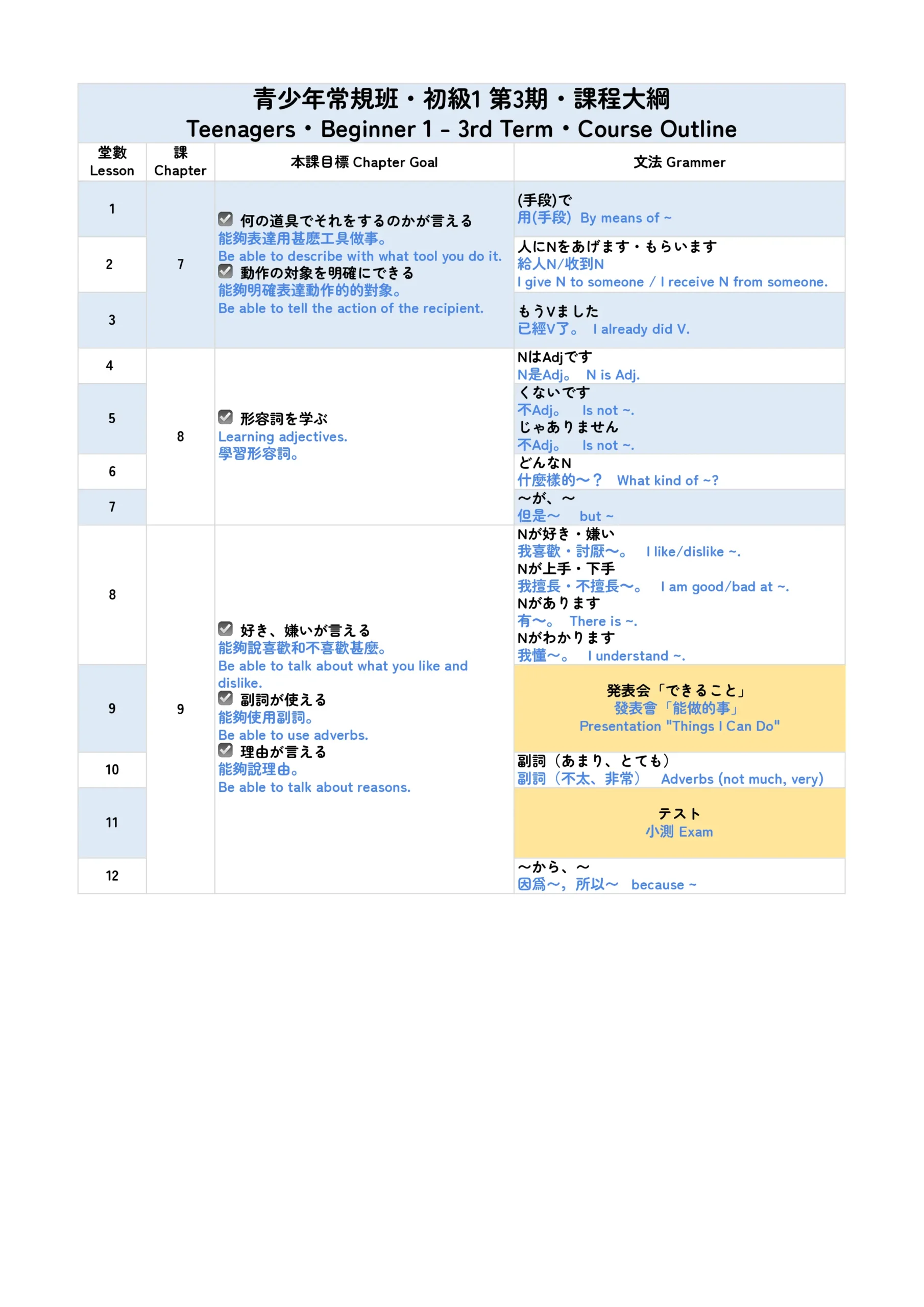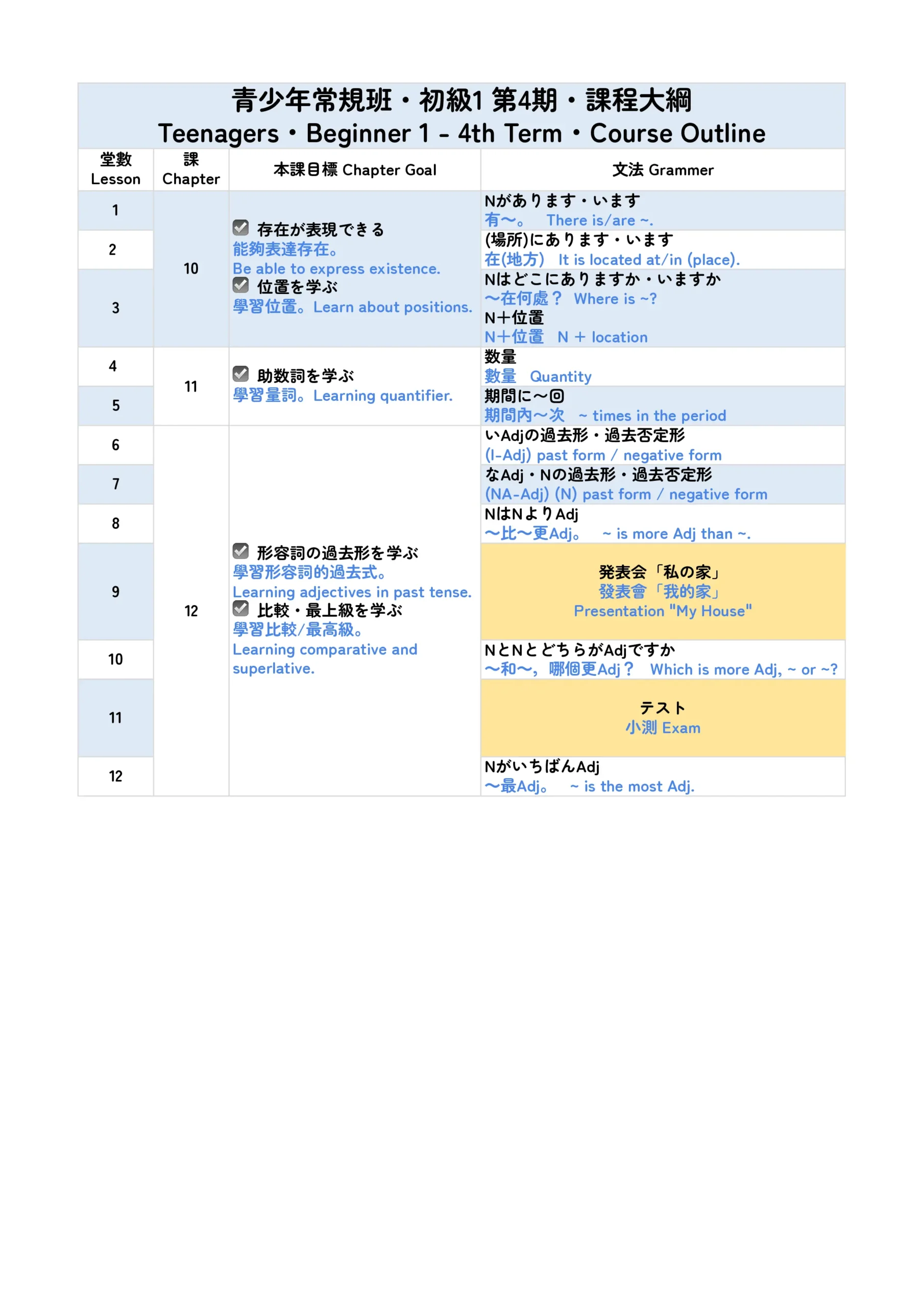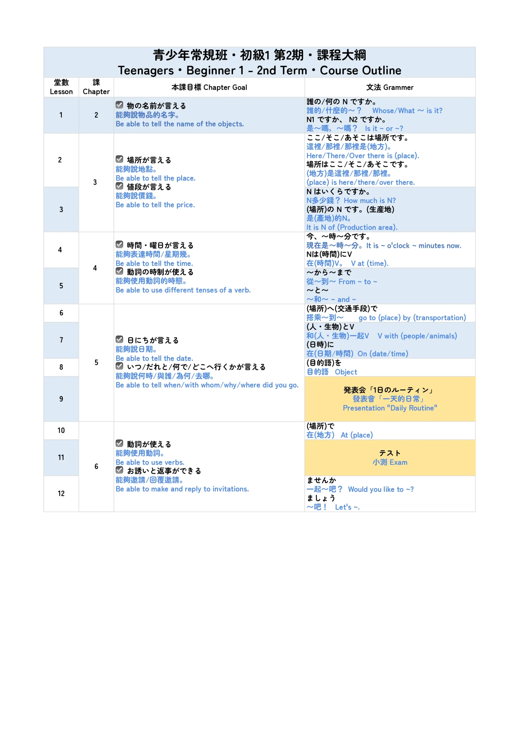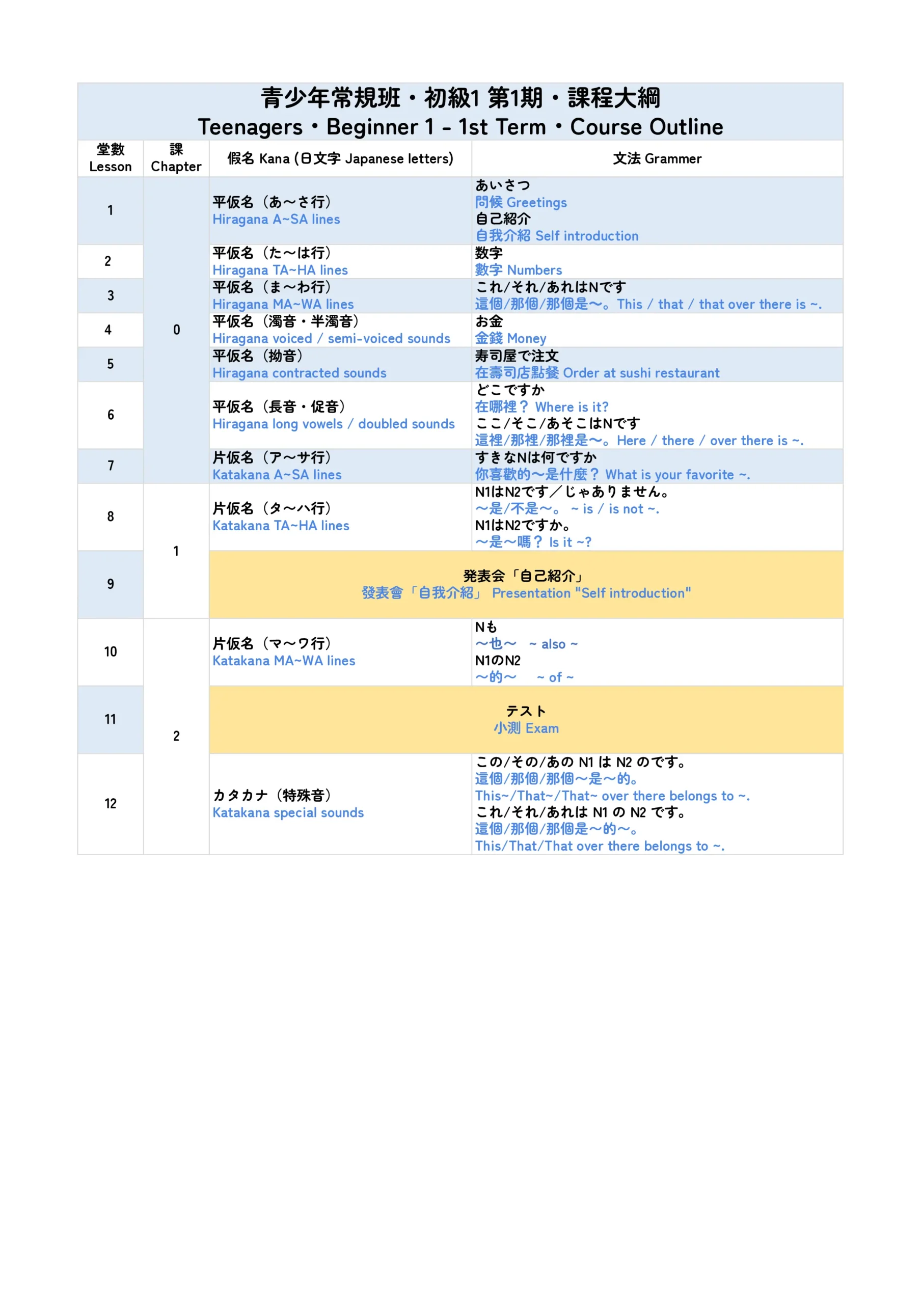 青少年常規班 第一年 初級1 Beginner1 [N5] 課程詳細 Course Details